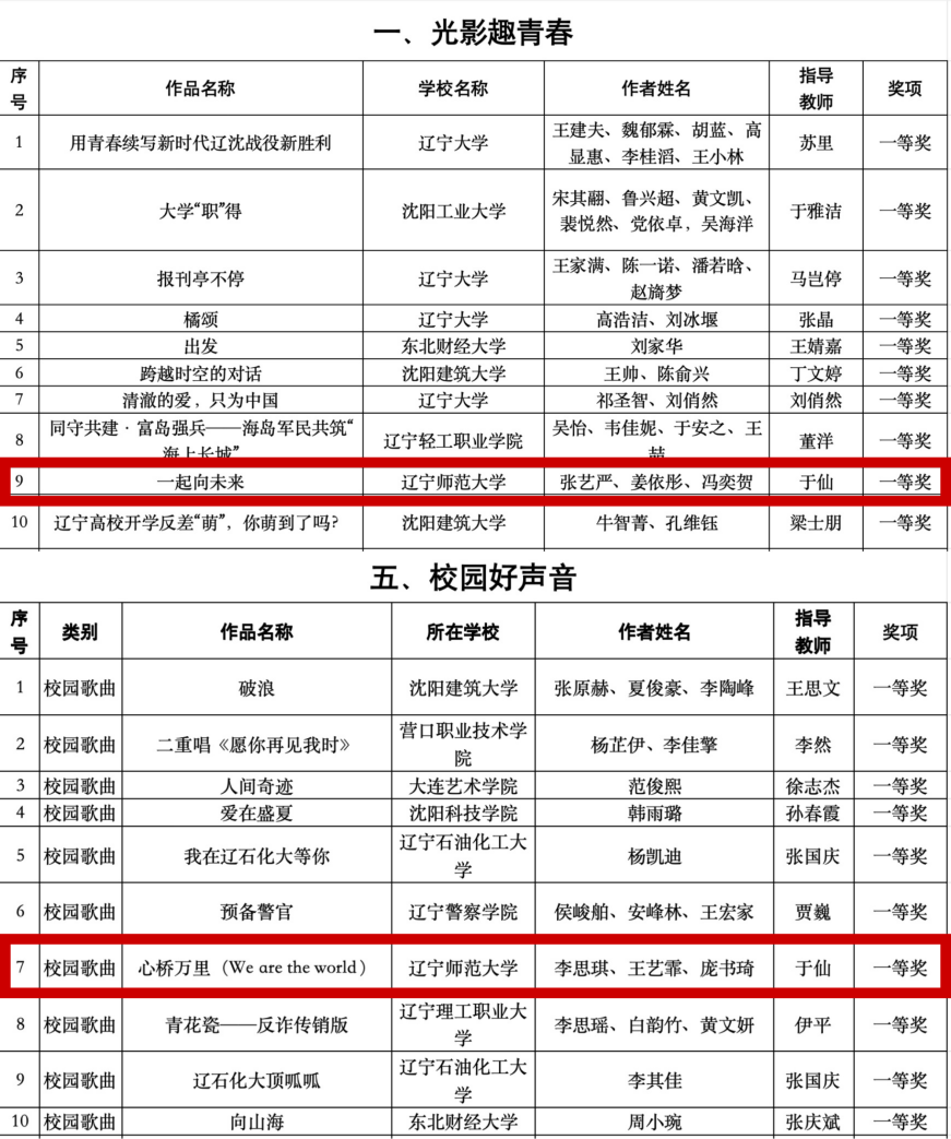 近日,由省委教育工委、省教育厅联合组织的第七届辽宁省大学生网络文化节和全省高校网络教育优秀作品推选展示活动圆满落幕。我院融媒体中心凭借深刻的主题内涵与创新的创作形式脱颖而出,两部参赛作品《一起向未来》《心桥万里(We Are the World)》分别在“光影趣青春”“校园好声音”赛道中斩获辽宁省一等奖,为学院赢得荣誉。
